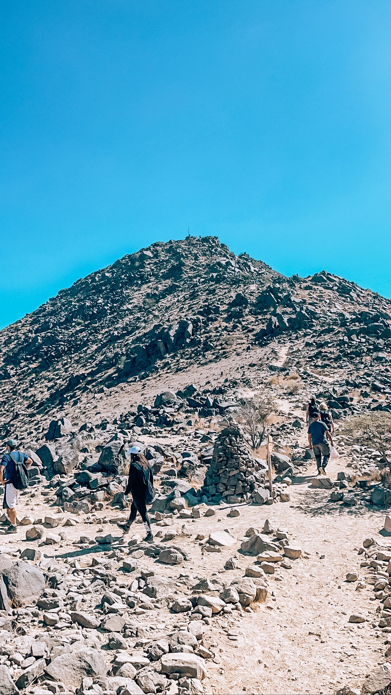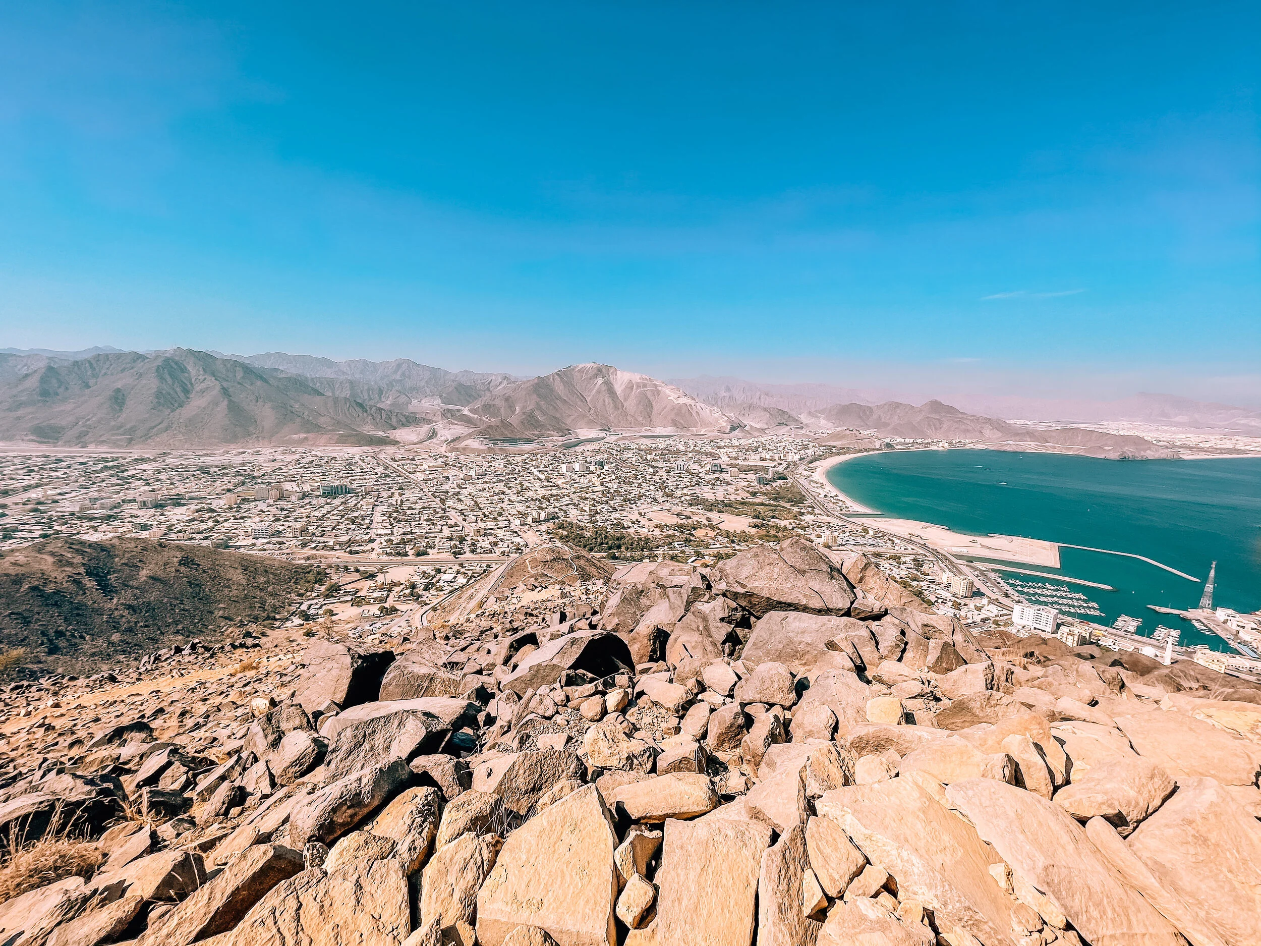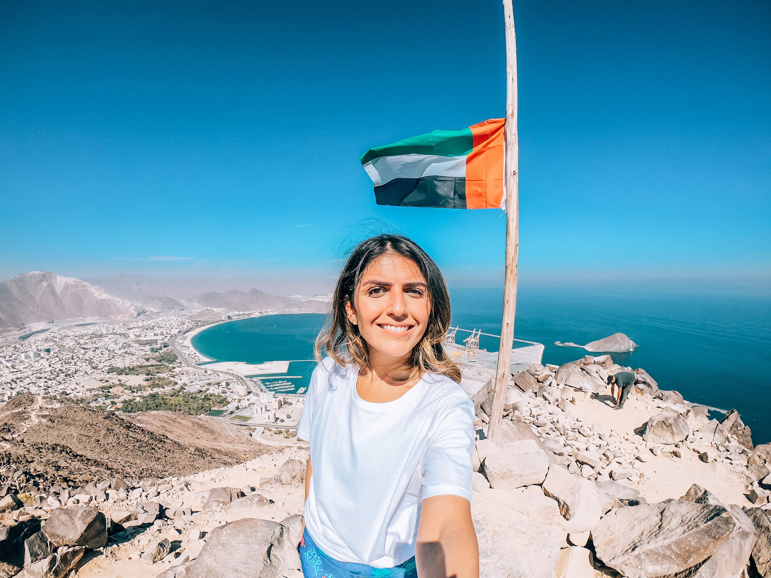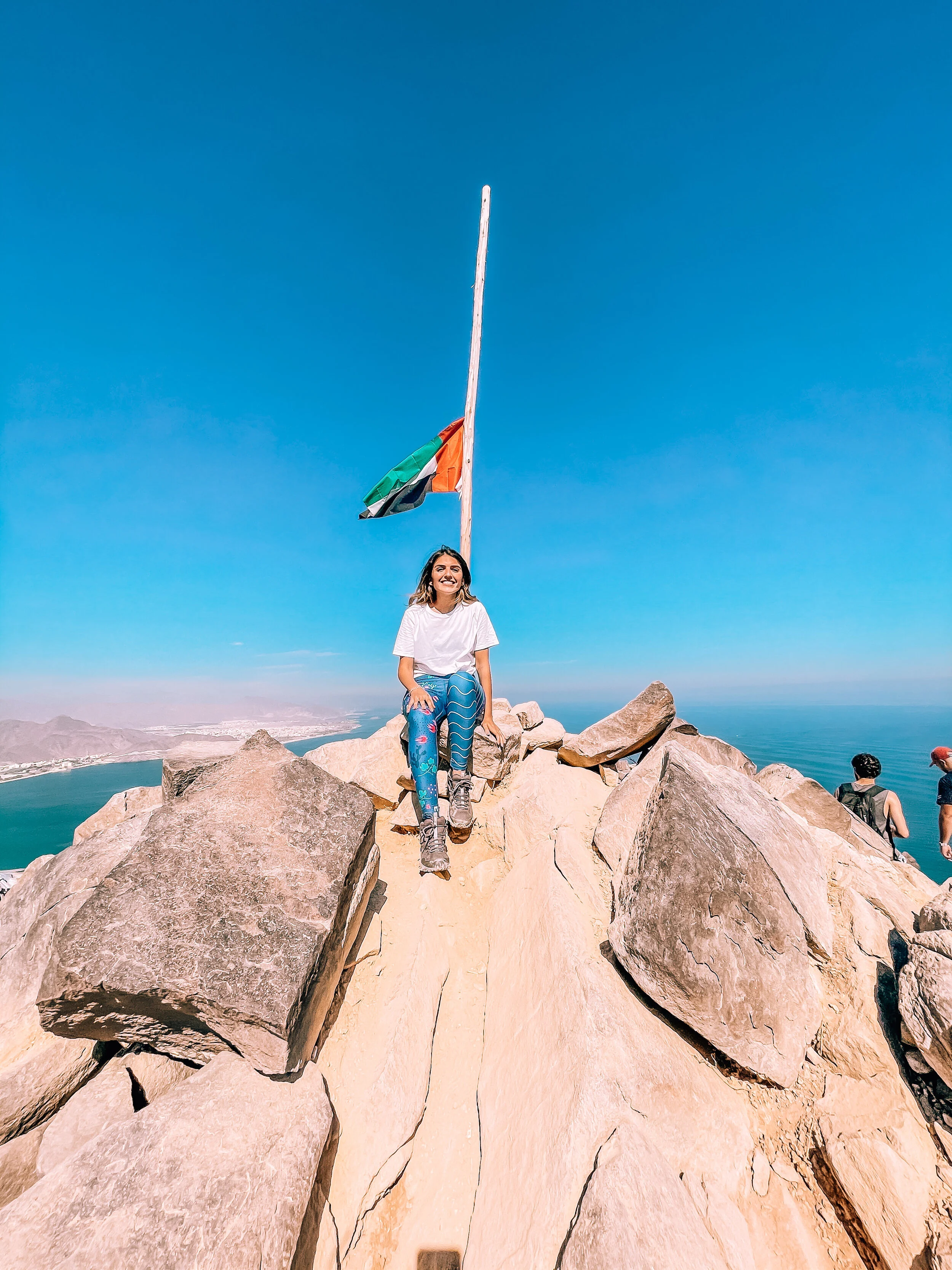 The trail can get quite busy on weekends, particularly on Fridays. So a Saturday hike is your best bet. The hike to the first peak takes 1.5 hours where you’ll find the 1st UAE flag, and panoramic views of the city. Here I usually sit down for a break and a bite, mesmerized by the views of the turquoise waters below. Afterwards, I continue the trail which goes downhill to a rest area before going back uphill again.