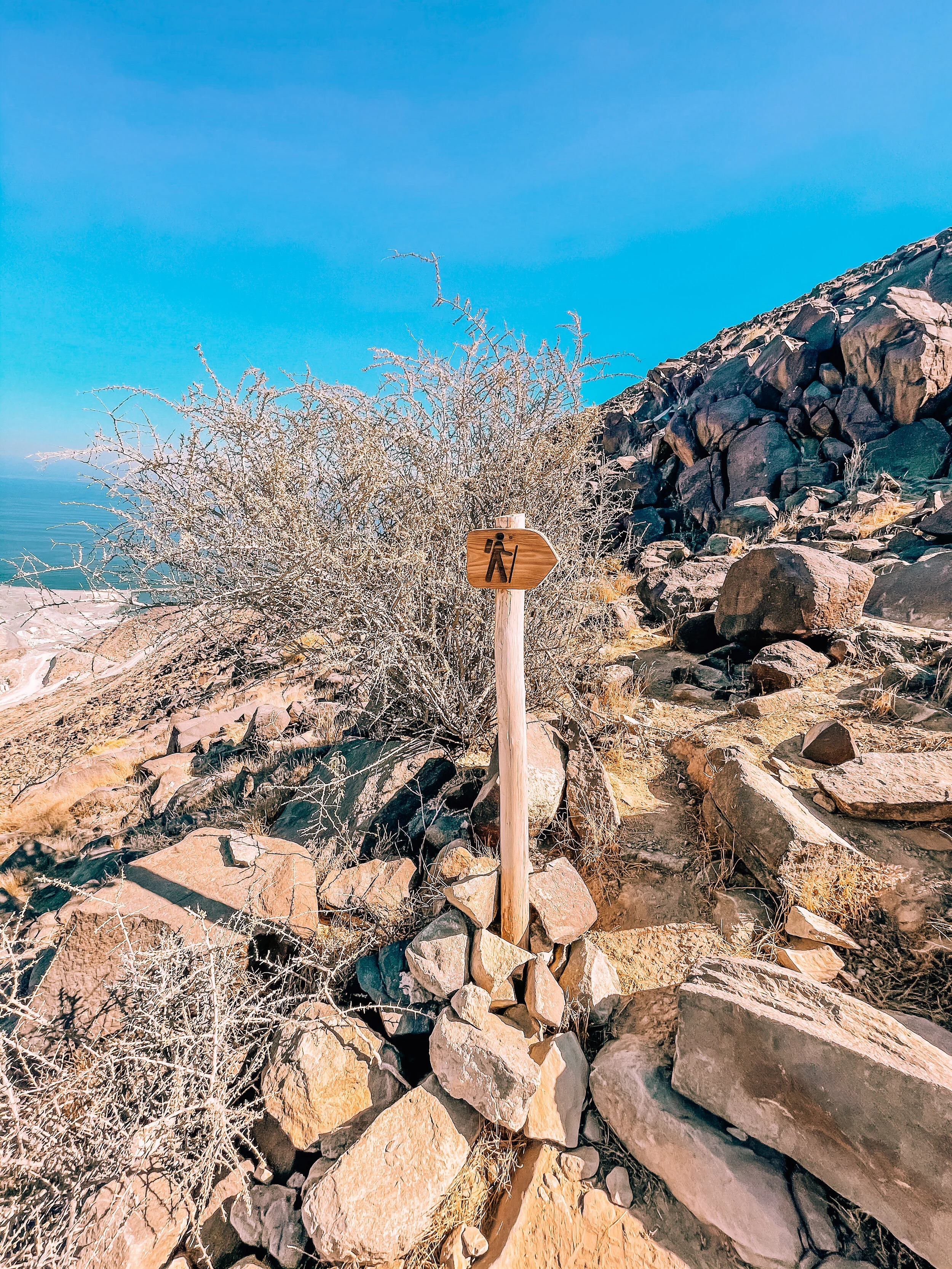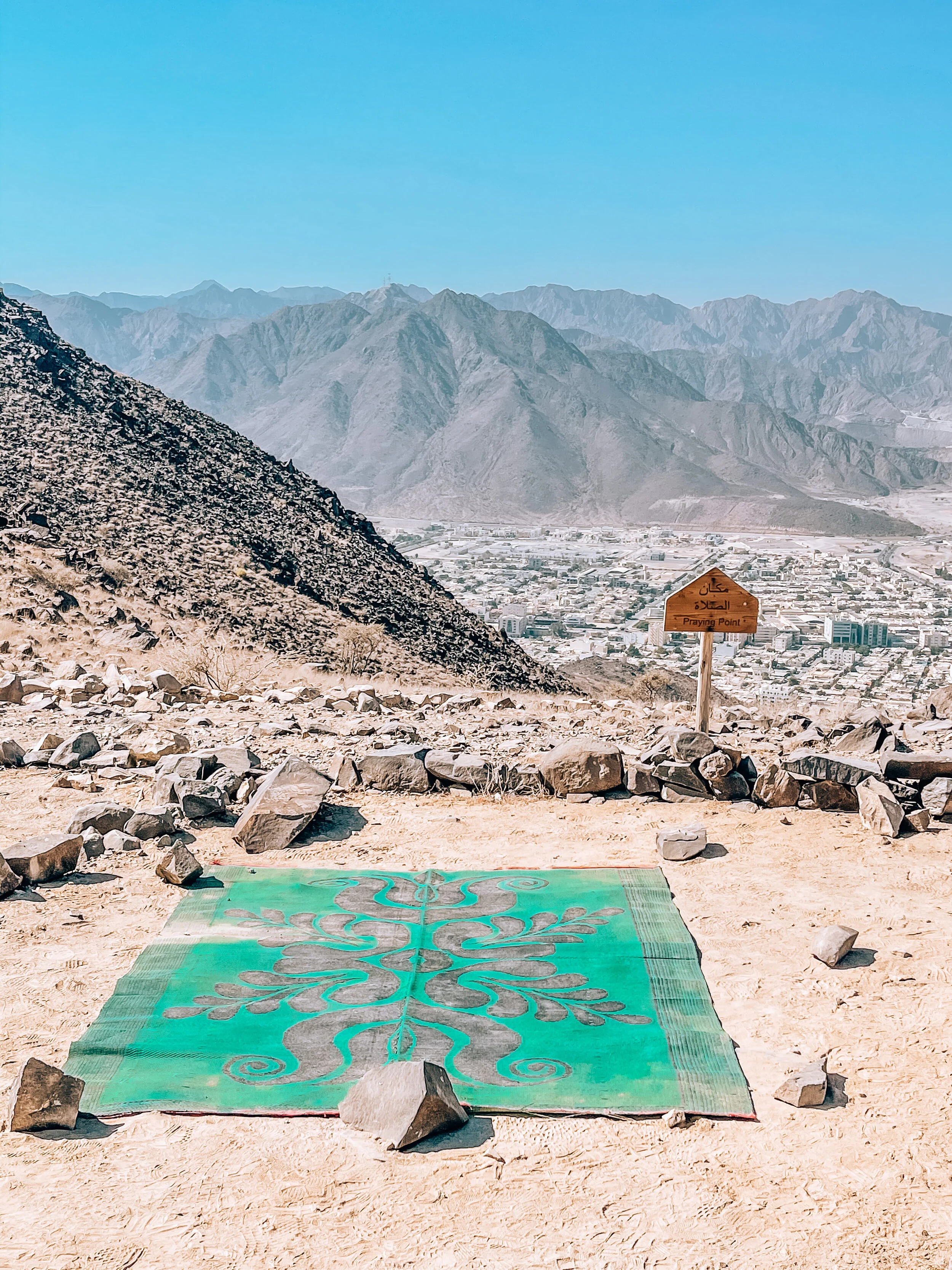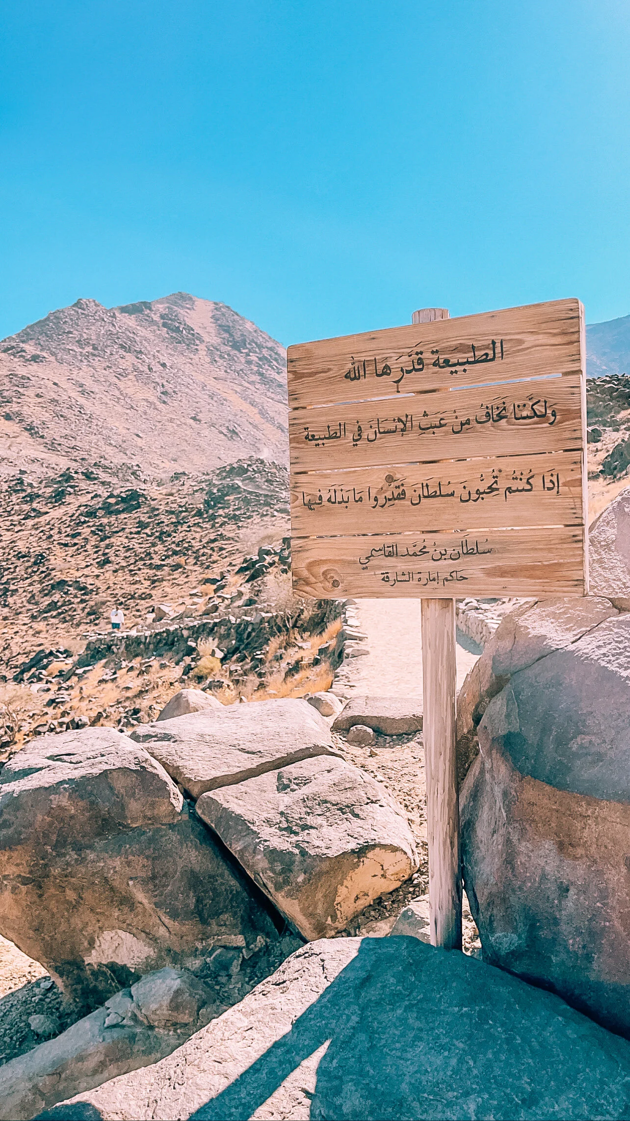The trail is super easy to follow and is signposted everywhere. It would be hard to get lost. The highest peak has an elevation of 1290 ft / 395 m. For reference, that would make it higher than the Eiffel Tower which is 1063 ft / 324 m. On the way up, there’s a message from today’s Ruler of Sharjah, Sheikh Sultan Al Qassimi which reads: ‘God cherished nature. We are wary of man’s tampering with nature. If you love Sultan, appreciate what he has done for nature’. So please, leave nothing but footprints!