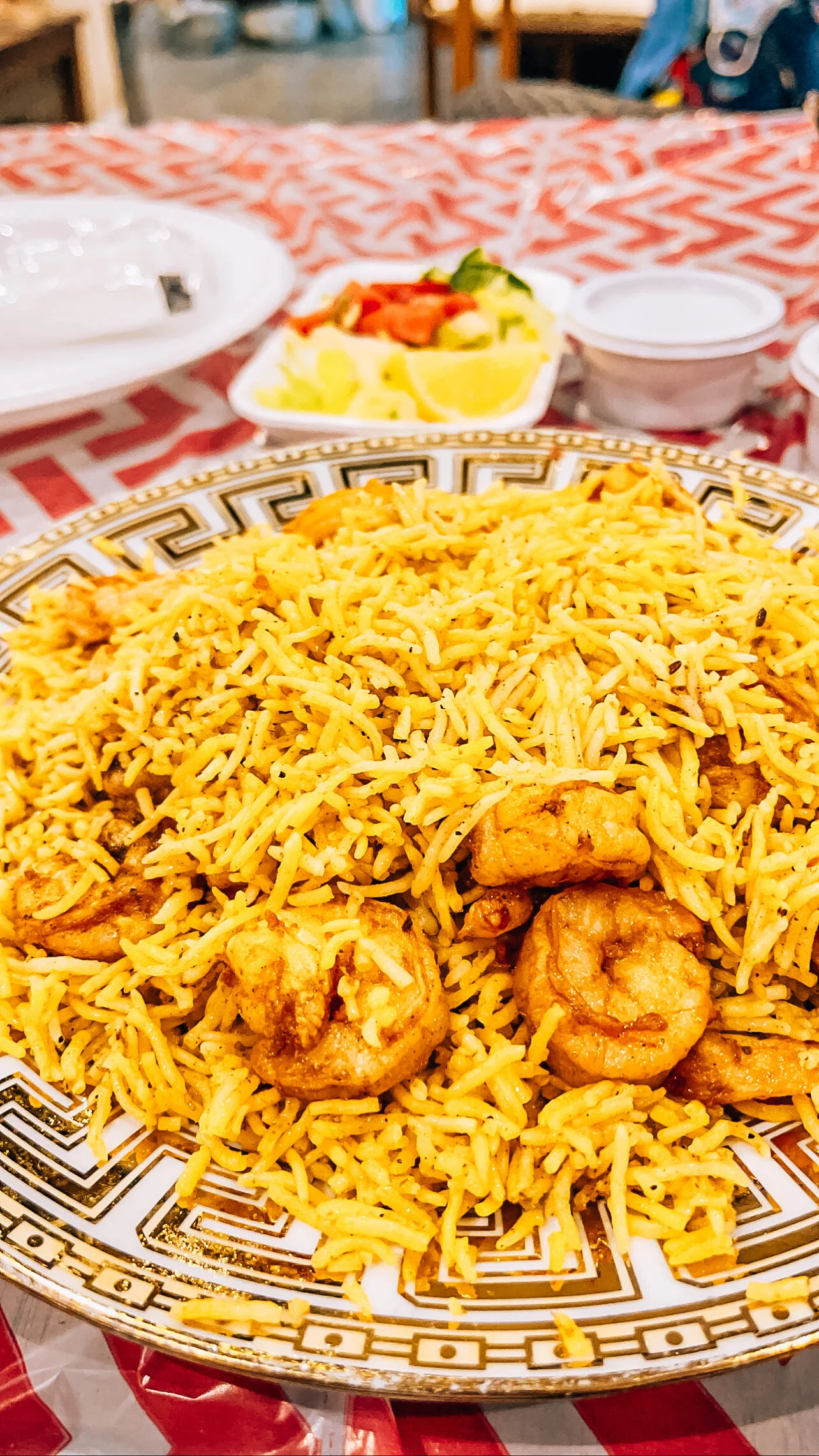 Khorfakkan is known for its seafood so I order the machboos rubyan. That’s shrimp with seasoned rice. The secret is to add a lot of lemon and veggies. Heavenly!